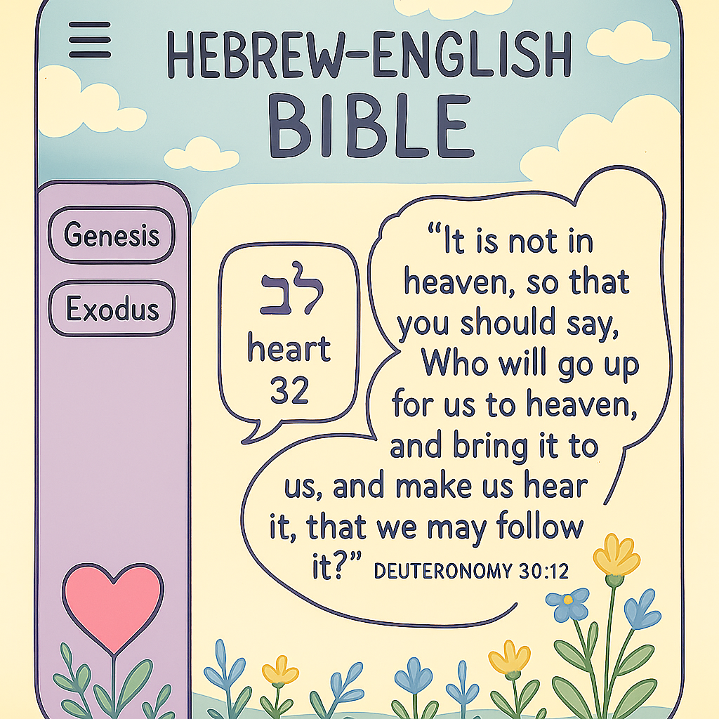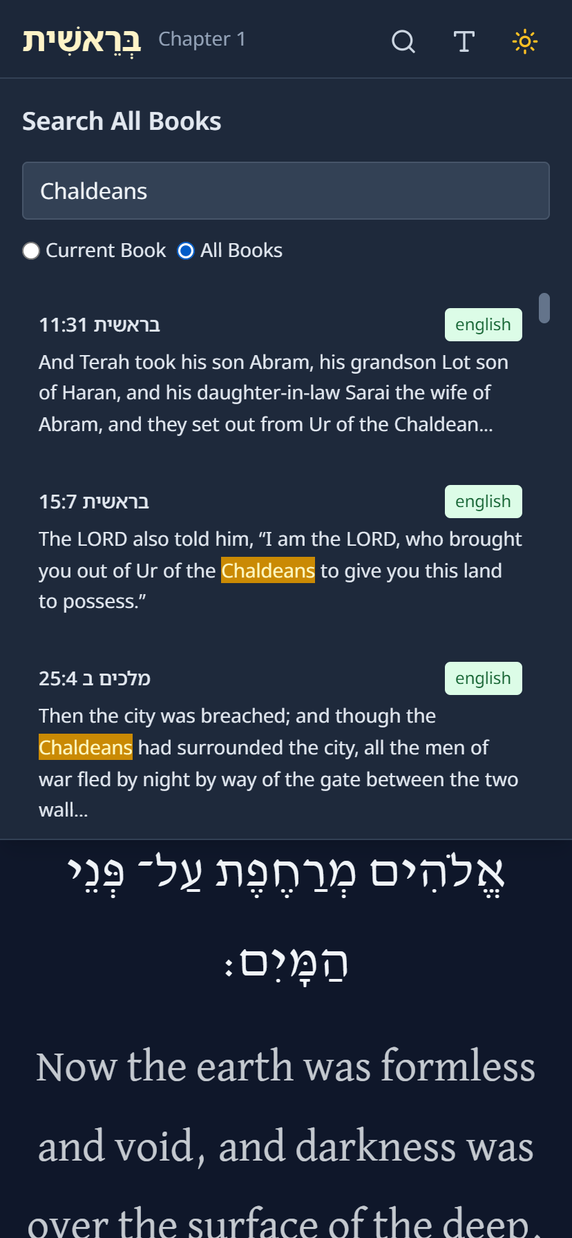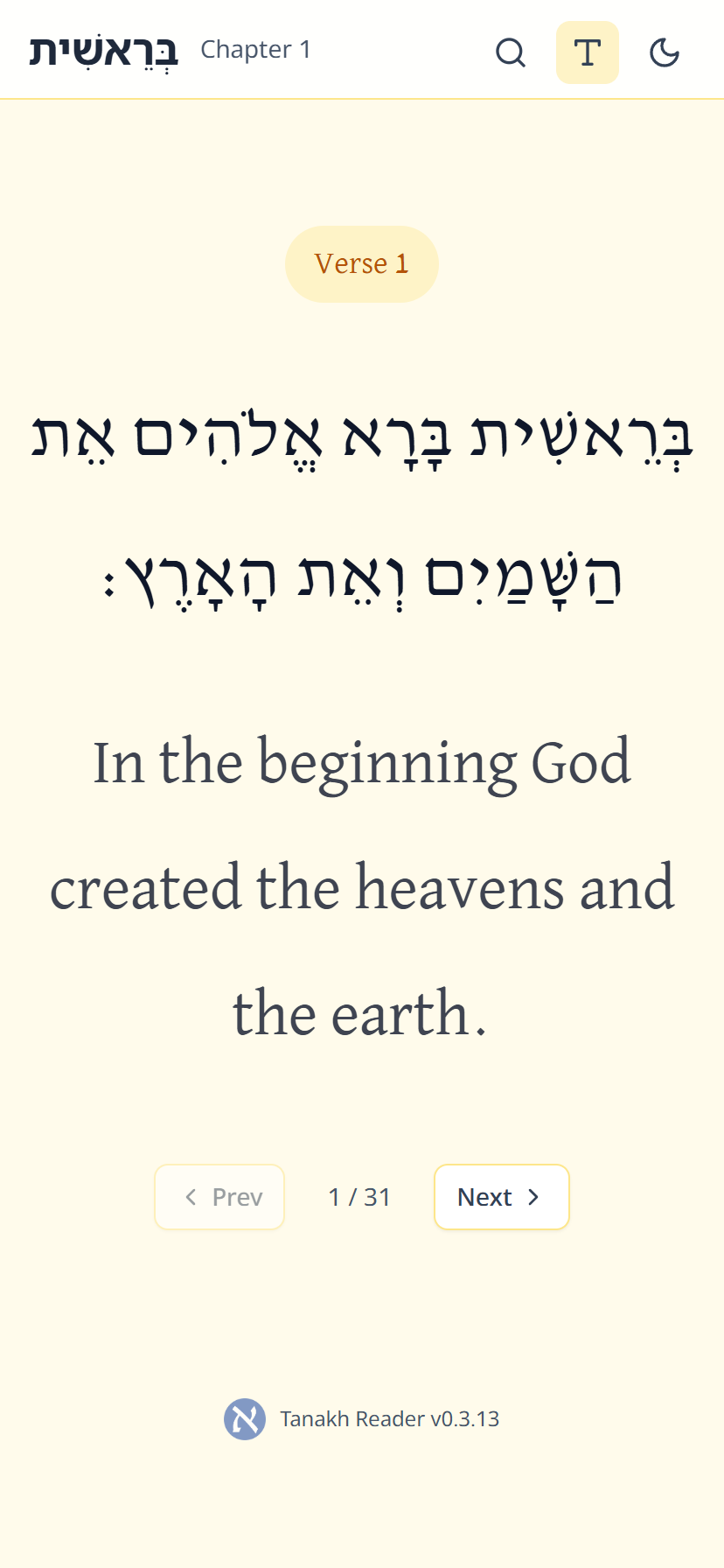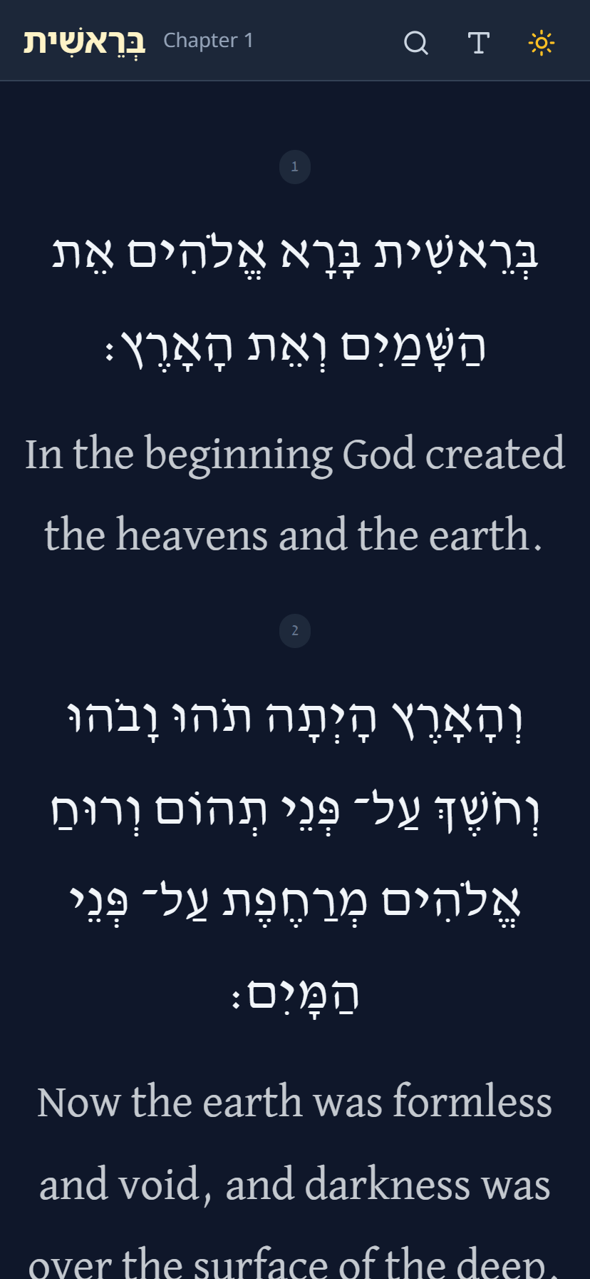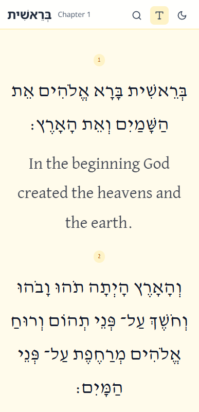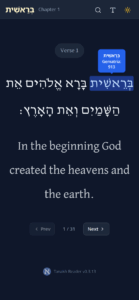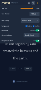 We are happy to share with you the Hebrew-English Bible web application that we developed for you today. Since the Torah is a book of poetry, we designed the application to reflect that, with simple, readable fonts and short lines, like a song. It’s mobile-friendly, features a night mode, allows you to change the font size, and enables you to search for words in Hebrew or English in every book. Moreover, it includes a gematria function for every Hebrew word.